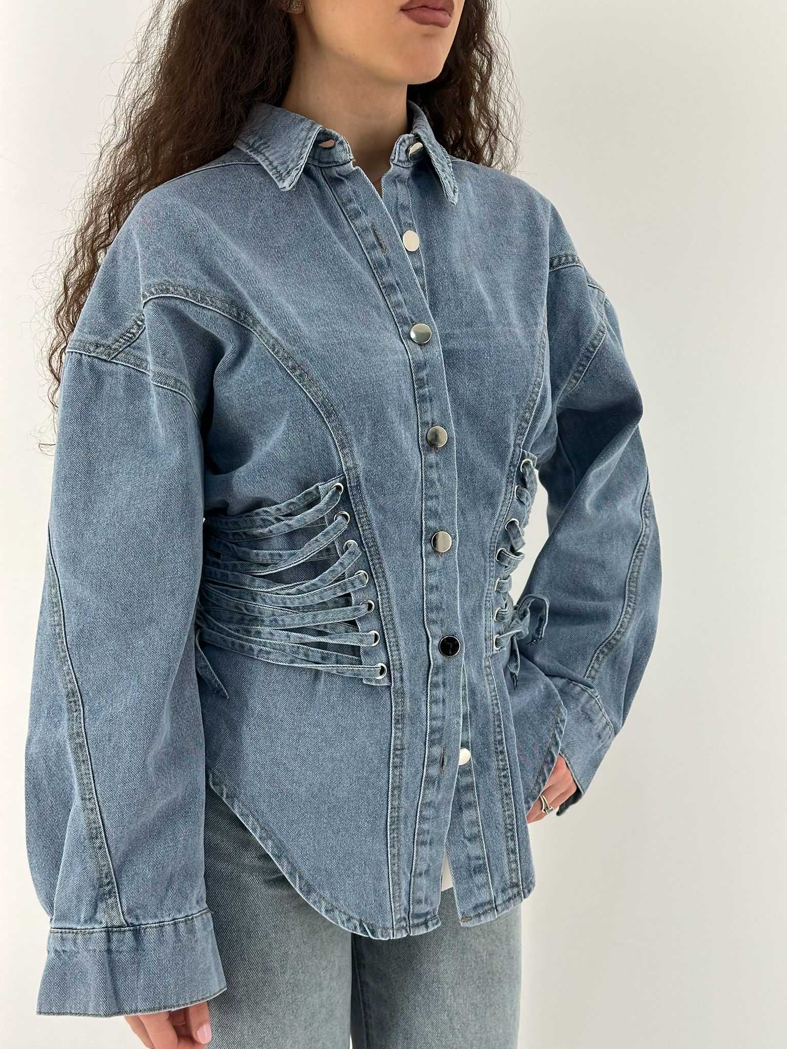Camicia jeansata in tessuto non elastico. Stringhe regolabili sui lati.