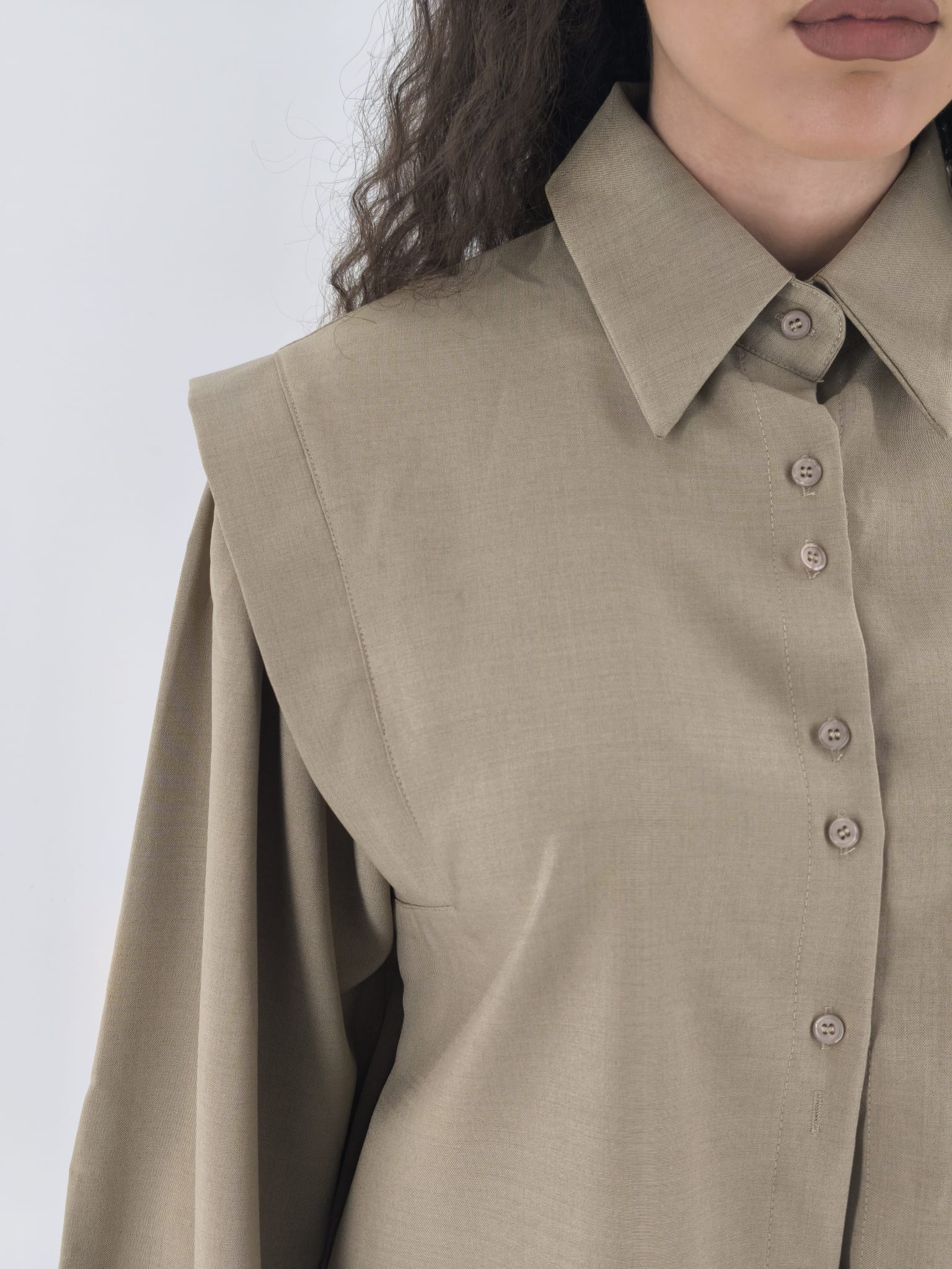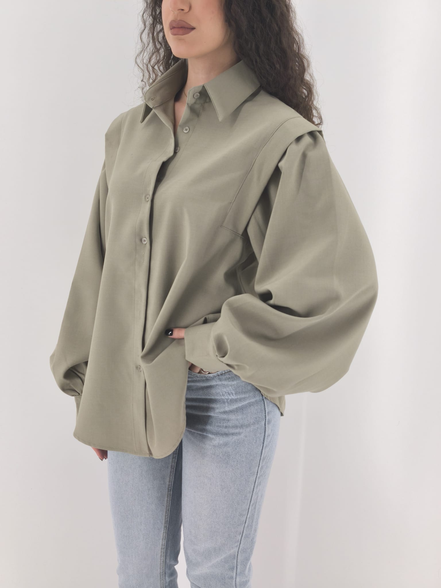 Camicia in tessuto con classica chiusura e particolare spallina. manica leggermente a sbuffo.
