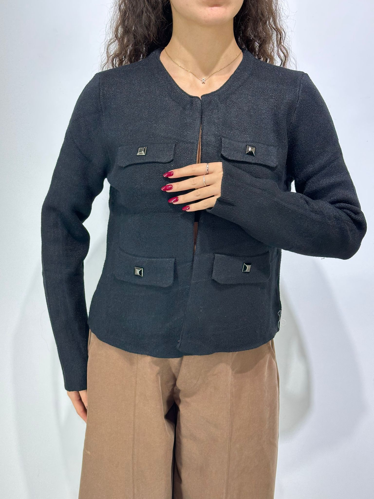 cardigan in lana con bottoni in oro. Finte tasche non funzionali.