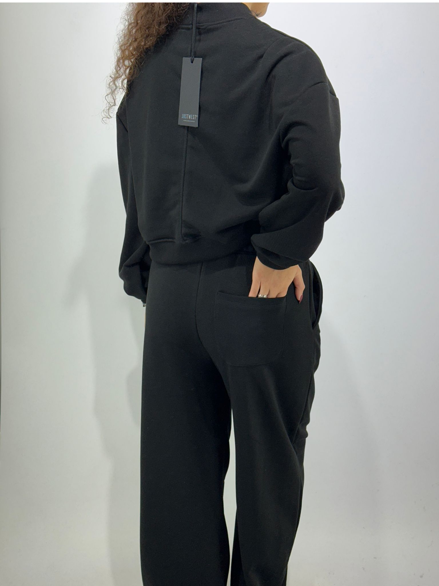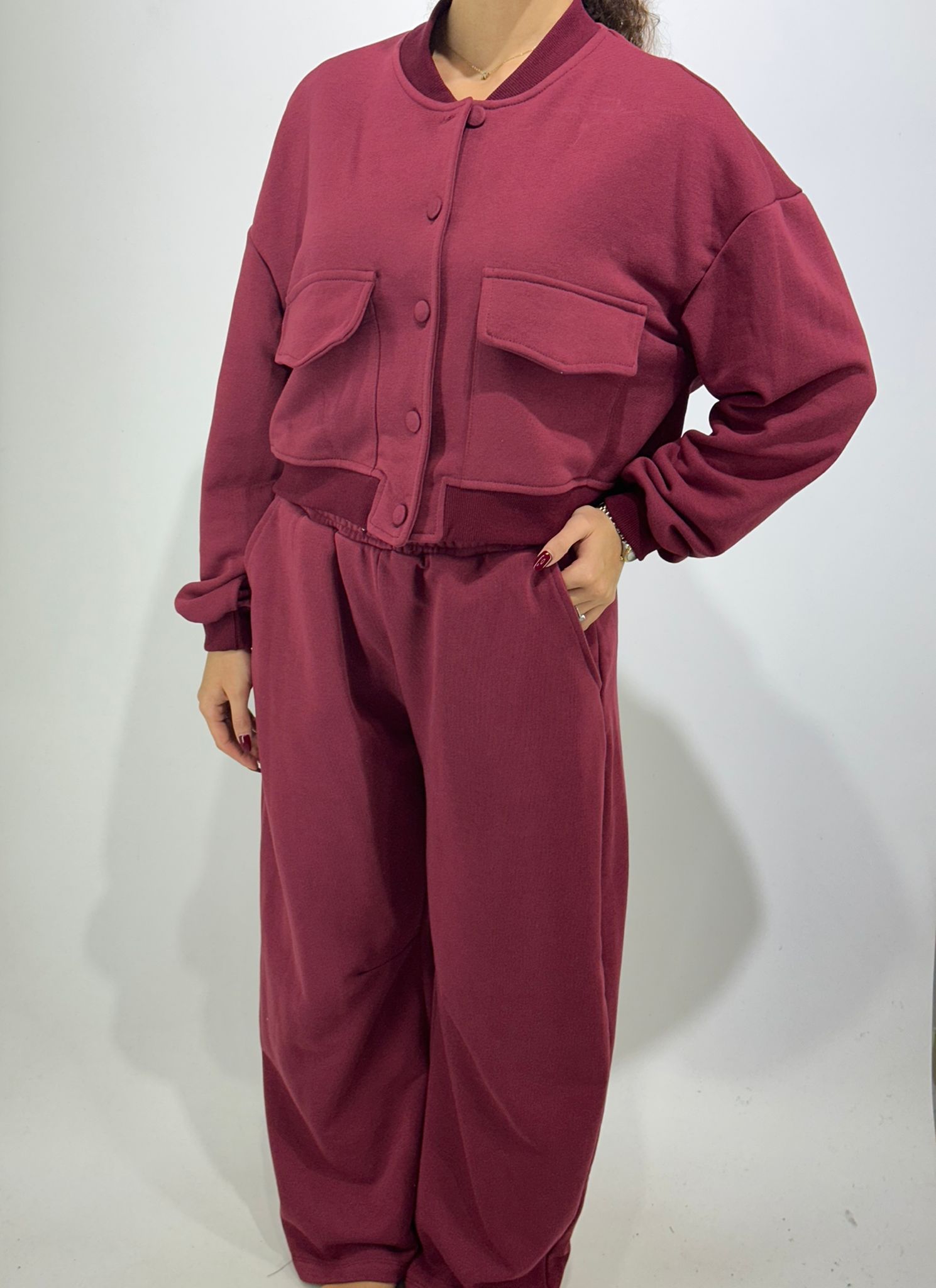 coordinato di tuta garzato. pantalone palazzo con molla e laccio in vita. giubbottino con bottoni.