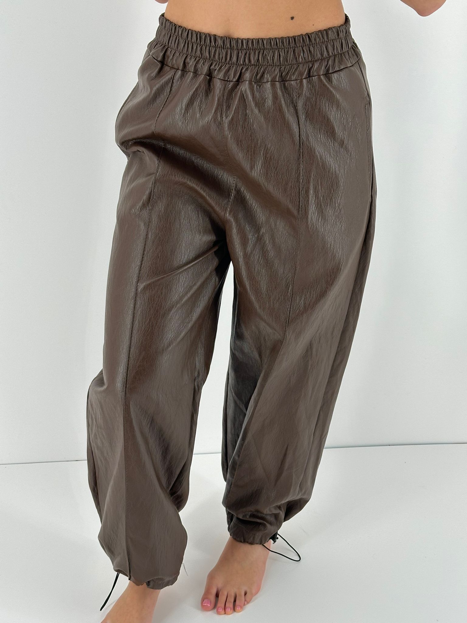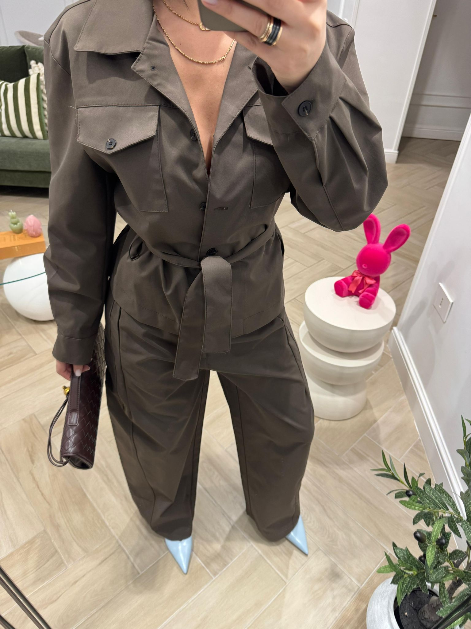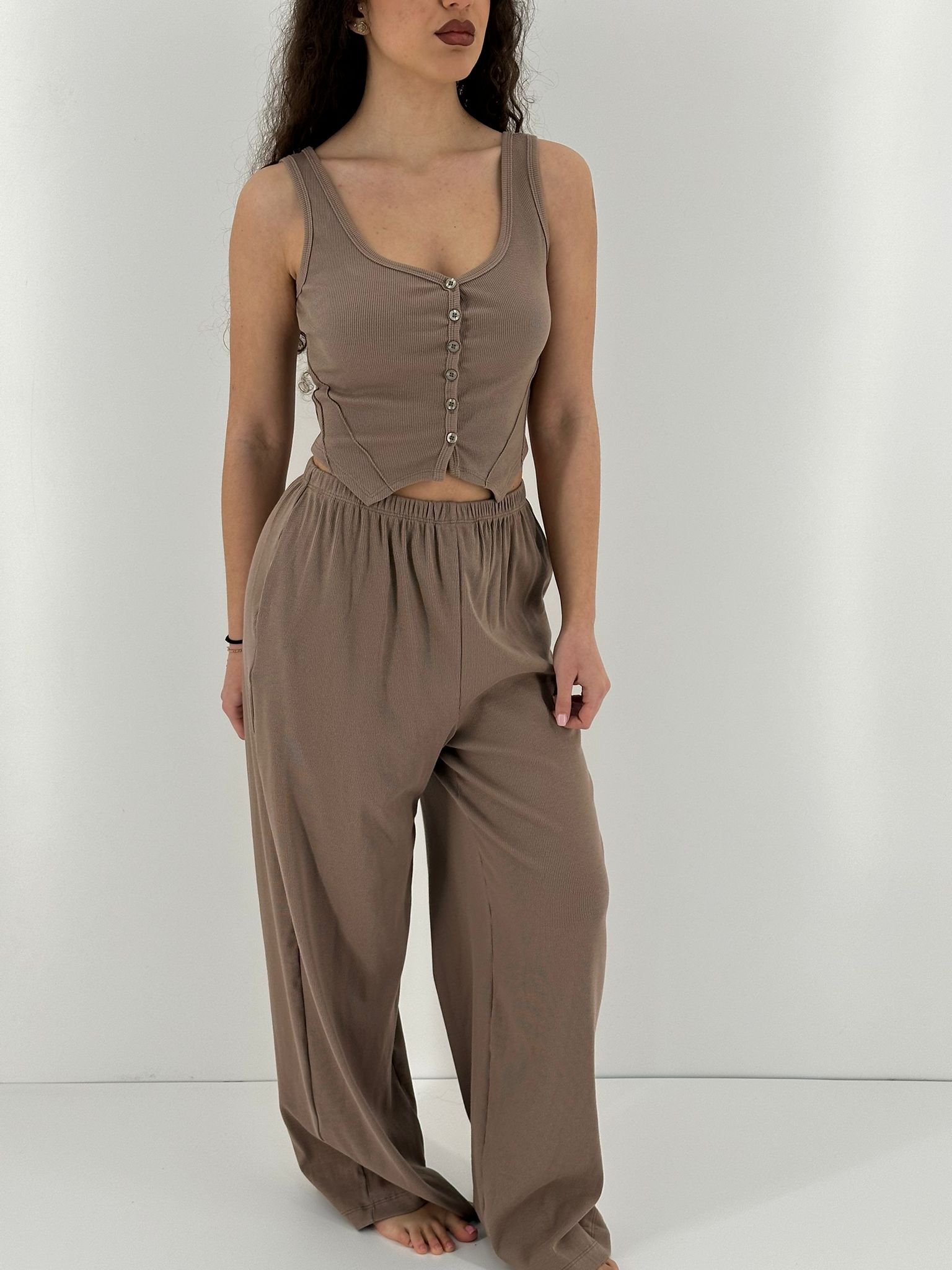 Cord set just west in tessuto con pantalone palazzo e top giro manica.