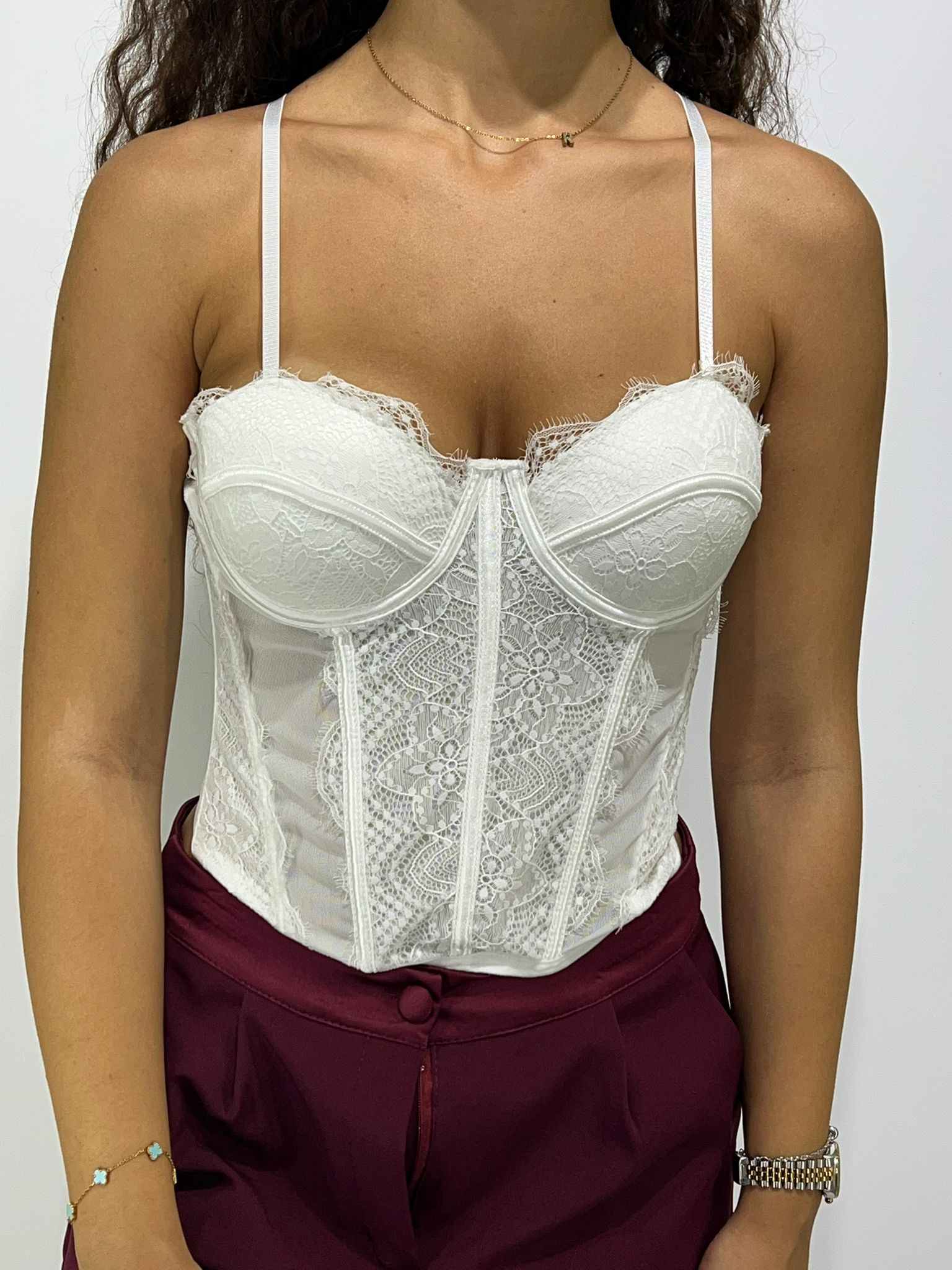 Corpetto in pizzo con bretelle regolabili e con bustino regolabile sul retro.