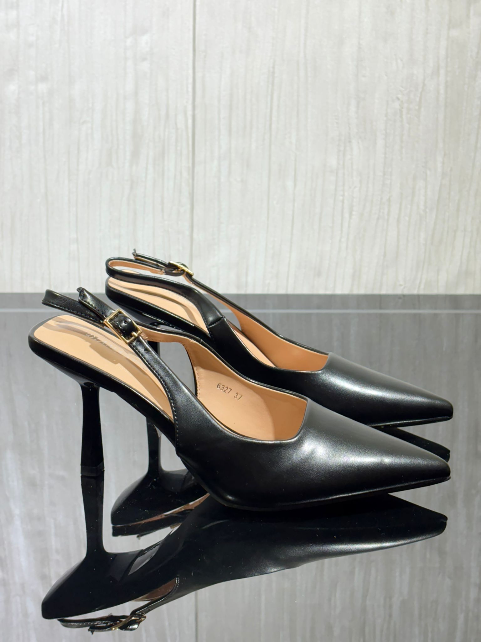 Decollette in ecopelle con fibbia regolabile. Tacco a campana alto circa 8 cm.