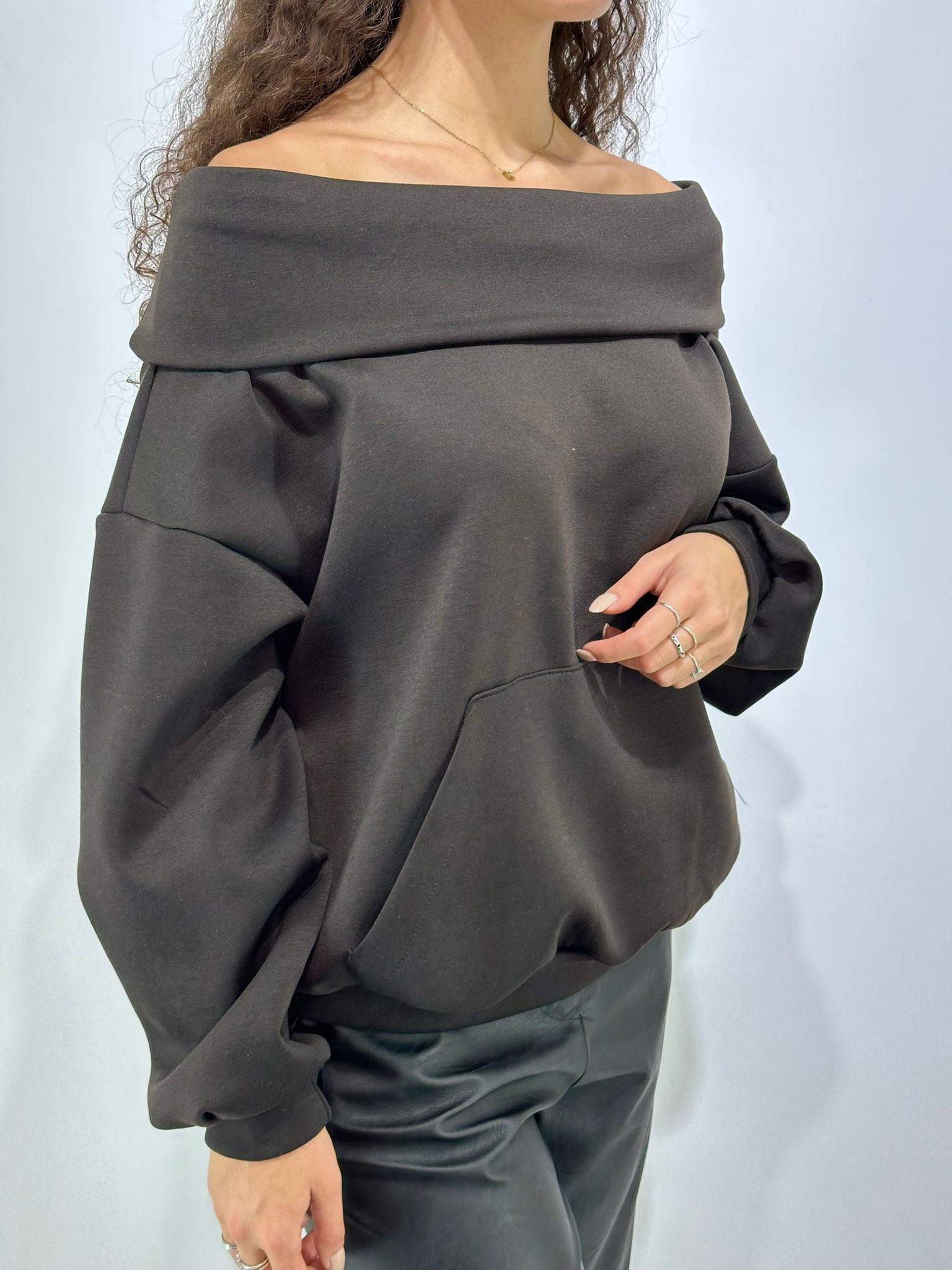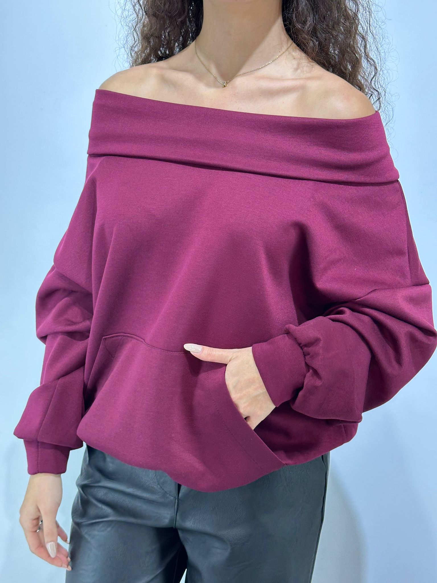 felpa con scollo a barca leggermente elastica. Veste fino ad una tg 44(M/L). Tascone funzionale.