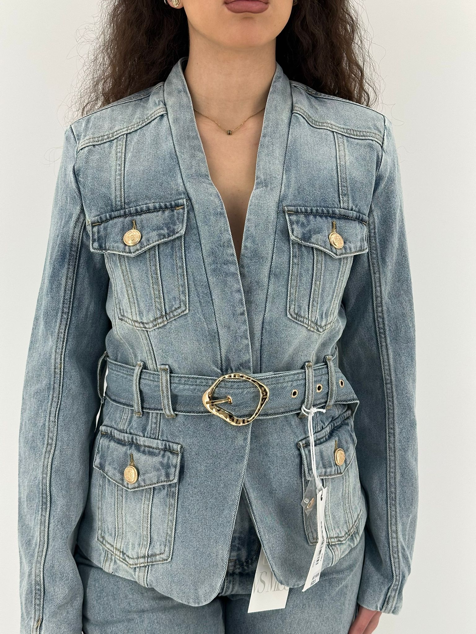 Giacca in jeans non elastico. Cintura in vita regolalbile. Tasche funzionali.