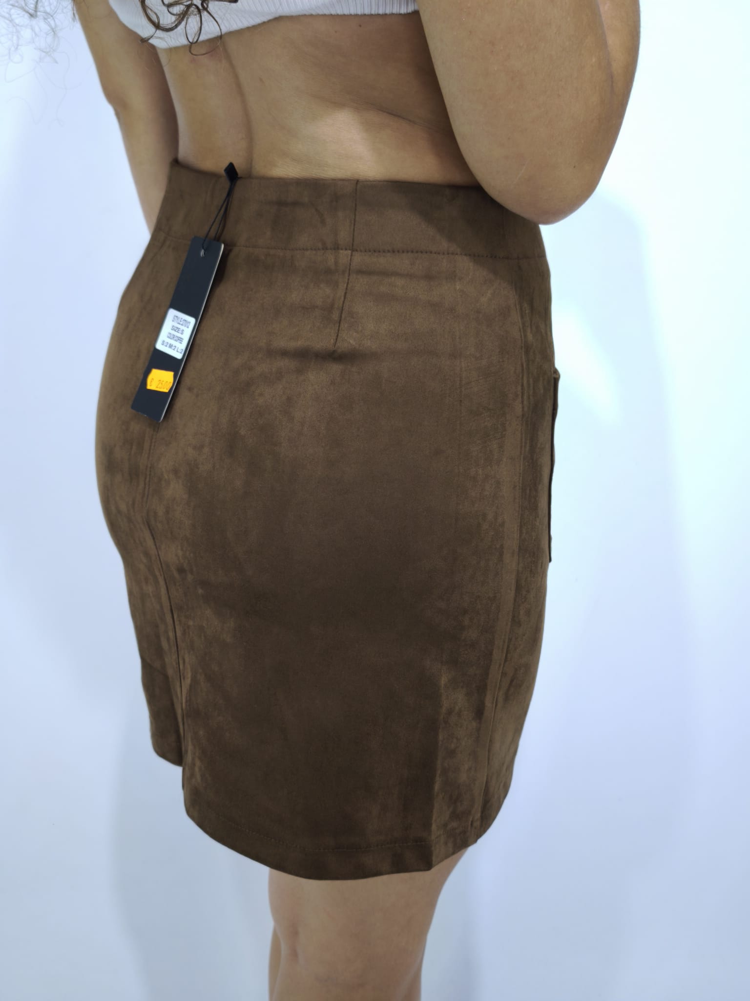 Gonna mini, in tessuto daino. Con bottoni e tasconi frontali. La modella indossa una tg.S