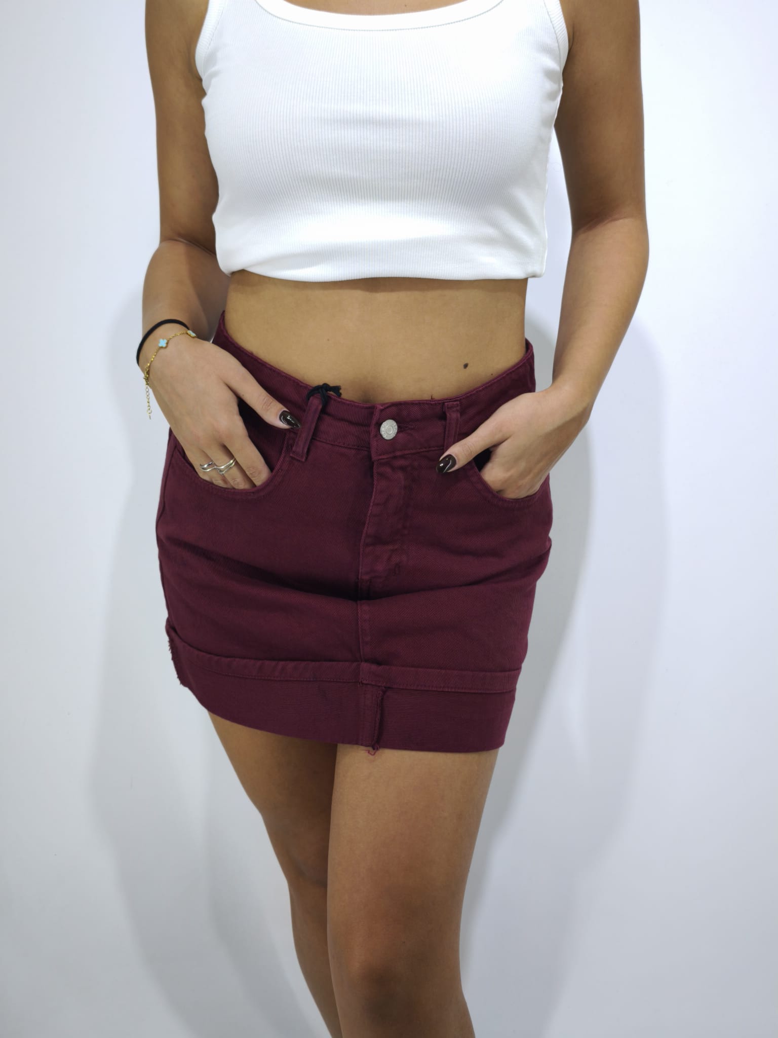 Gonna di jeans in tessuto poco elastico. la modella indossa una tg.S (bordeaux) mentre tg.M nella variante marrone.