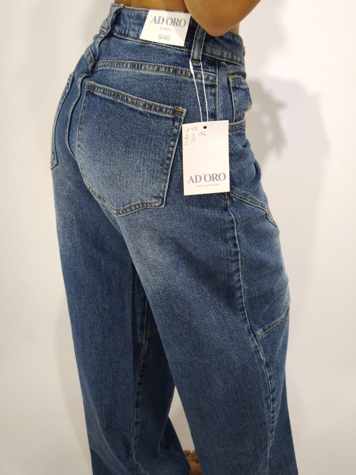Jeans modello barrel, leggermente elastico. La modella indossa tg S.