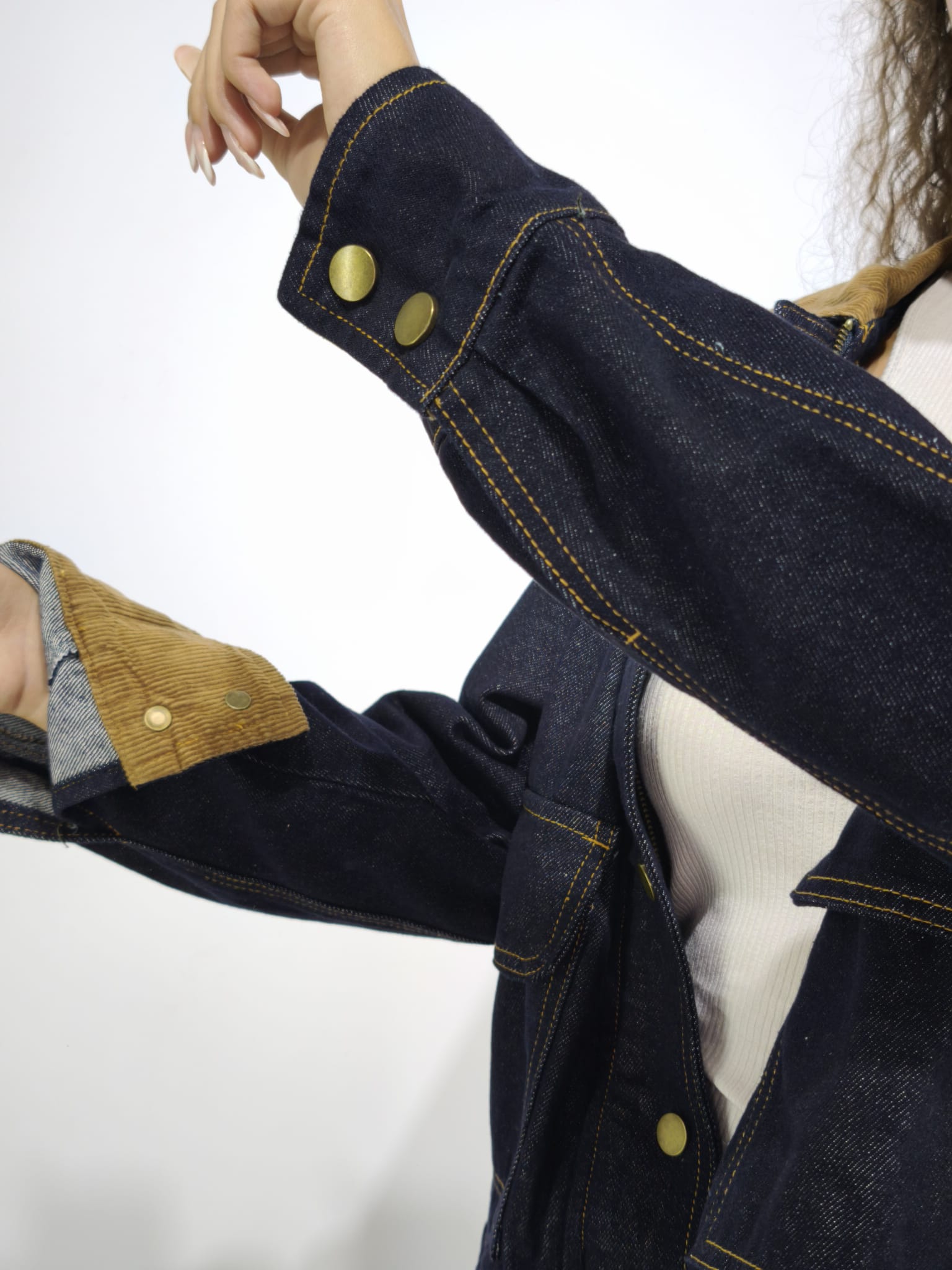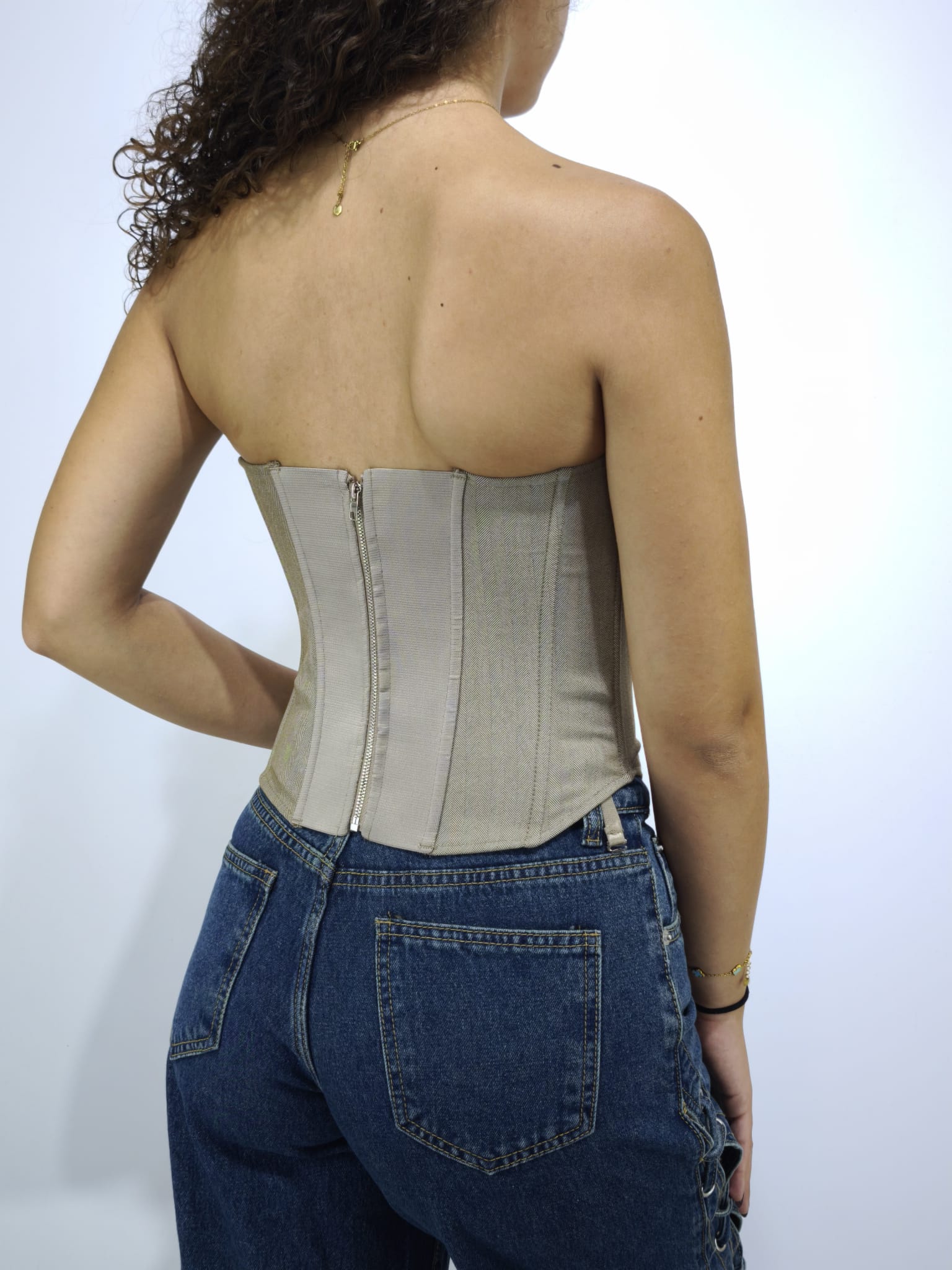 Jeans non elastico con macchie sul davanti. Cravatta removibile.