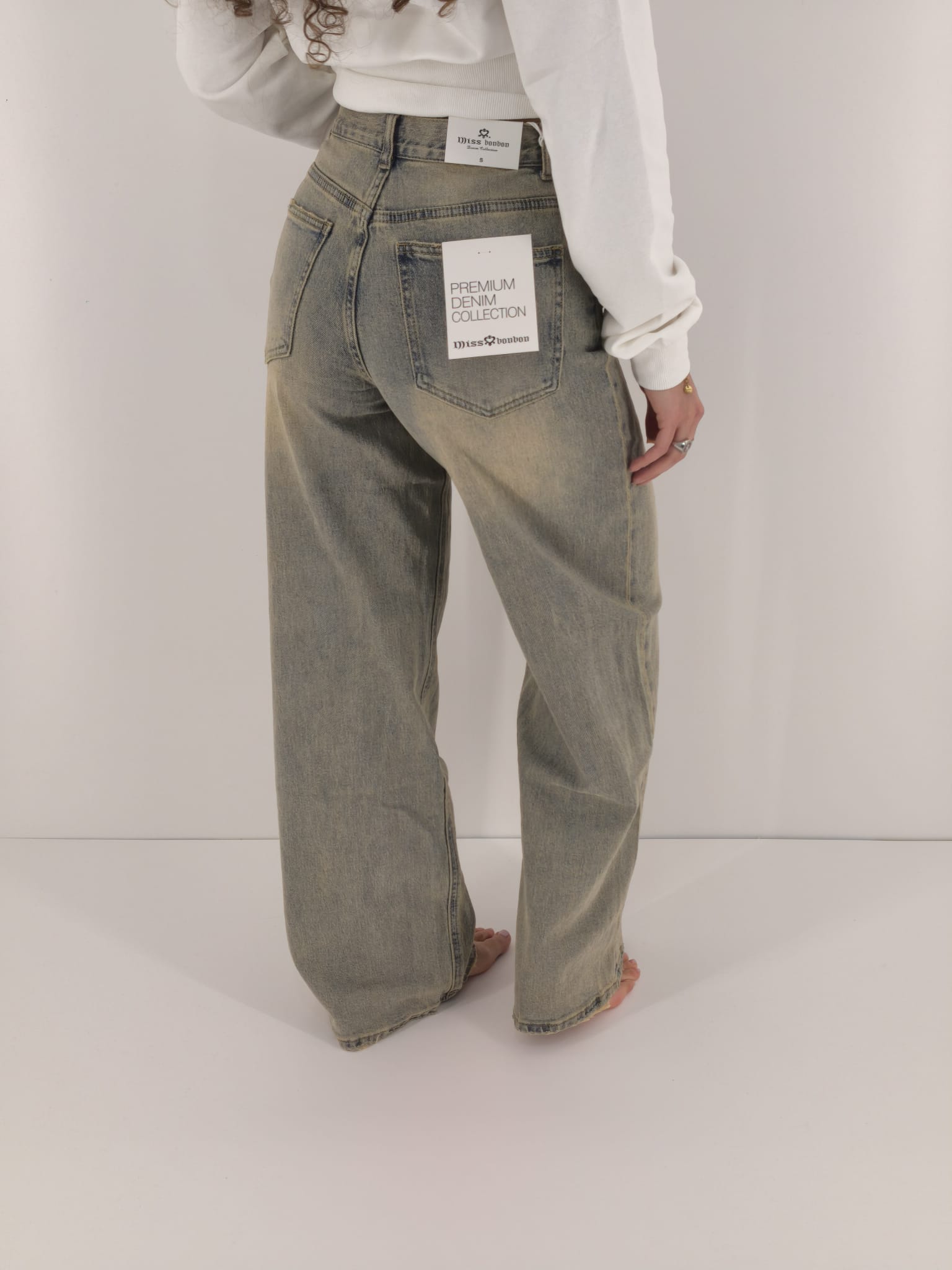 Jeans chiusura trasversale, modello palazzo, non elastico.