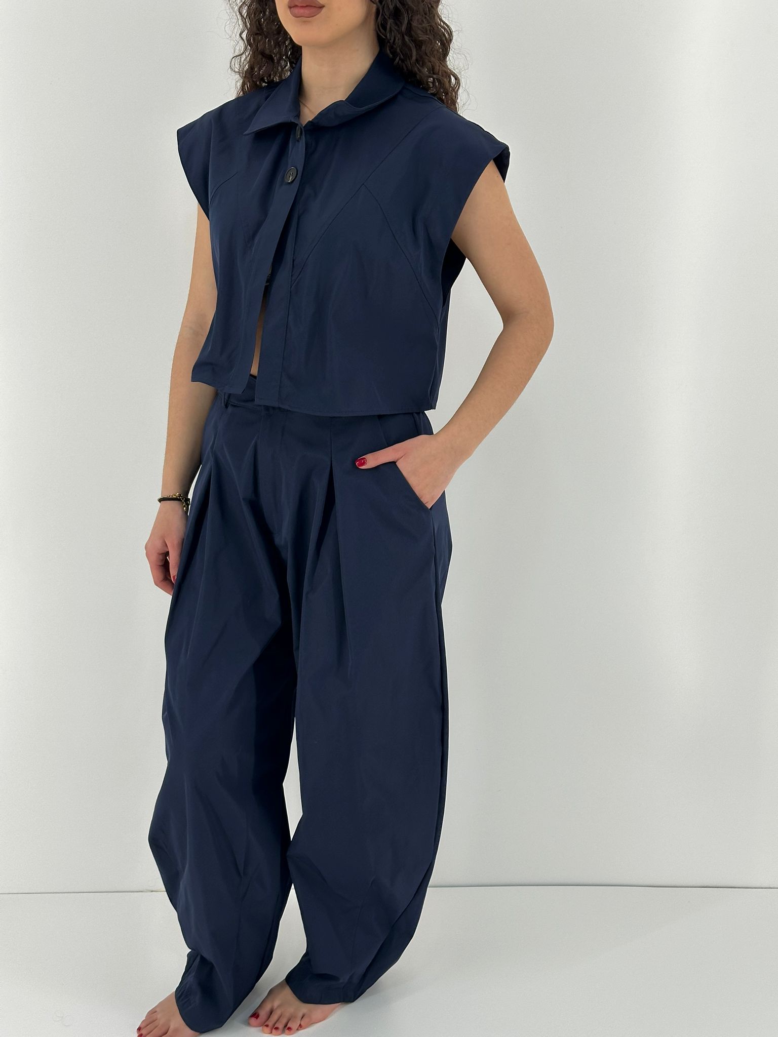 Jeans modello wide leg, chiusura traverso. Leggermente elastico. La modella indossa tg xs.