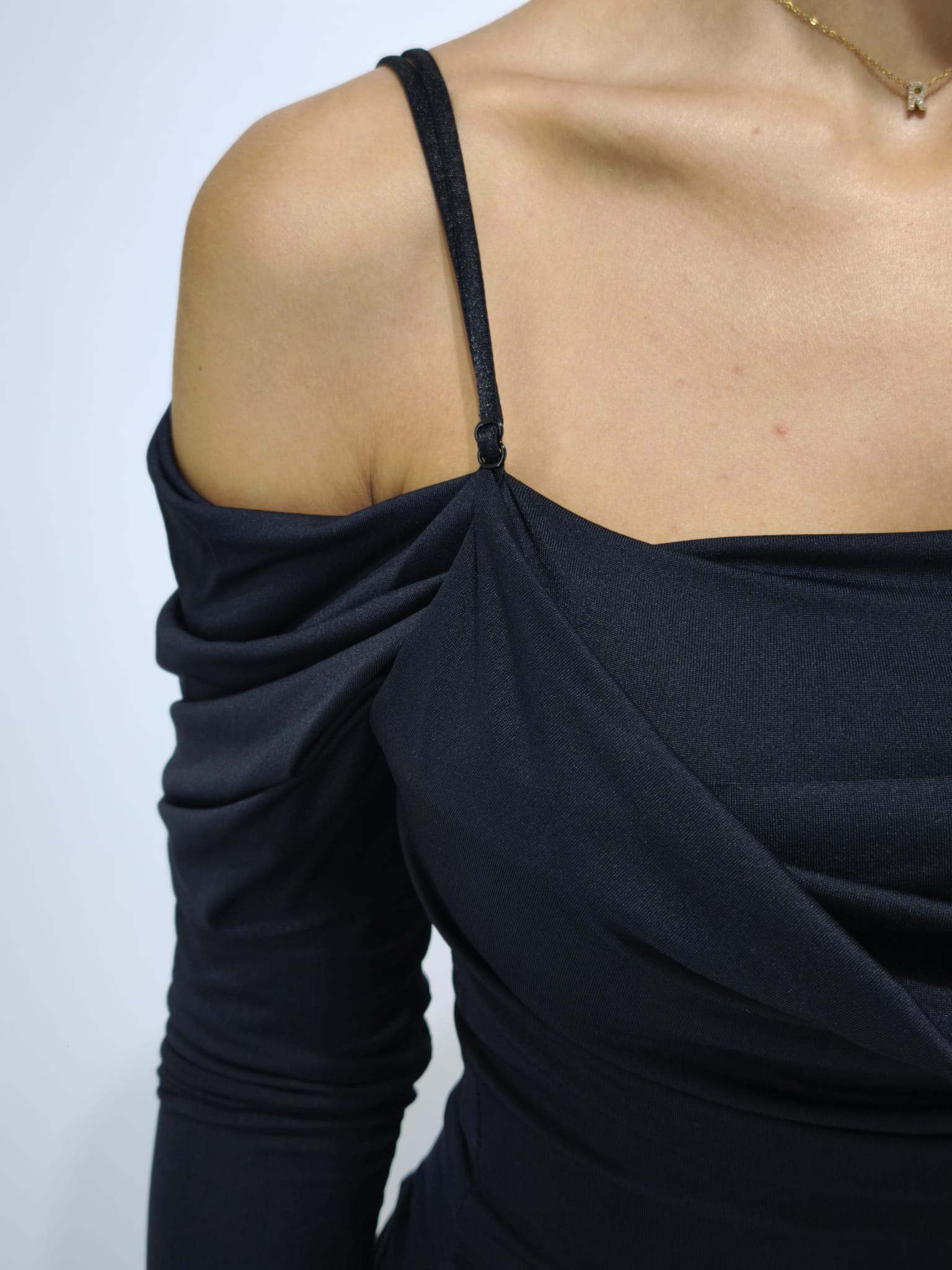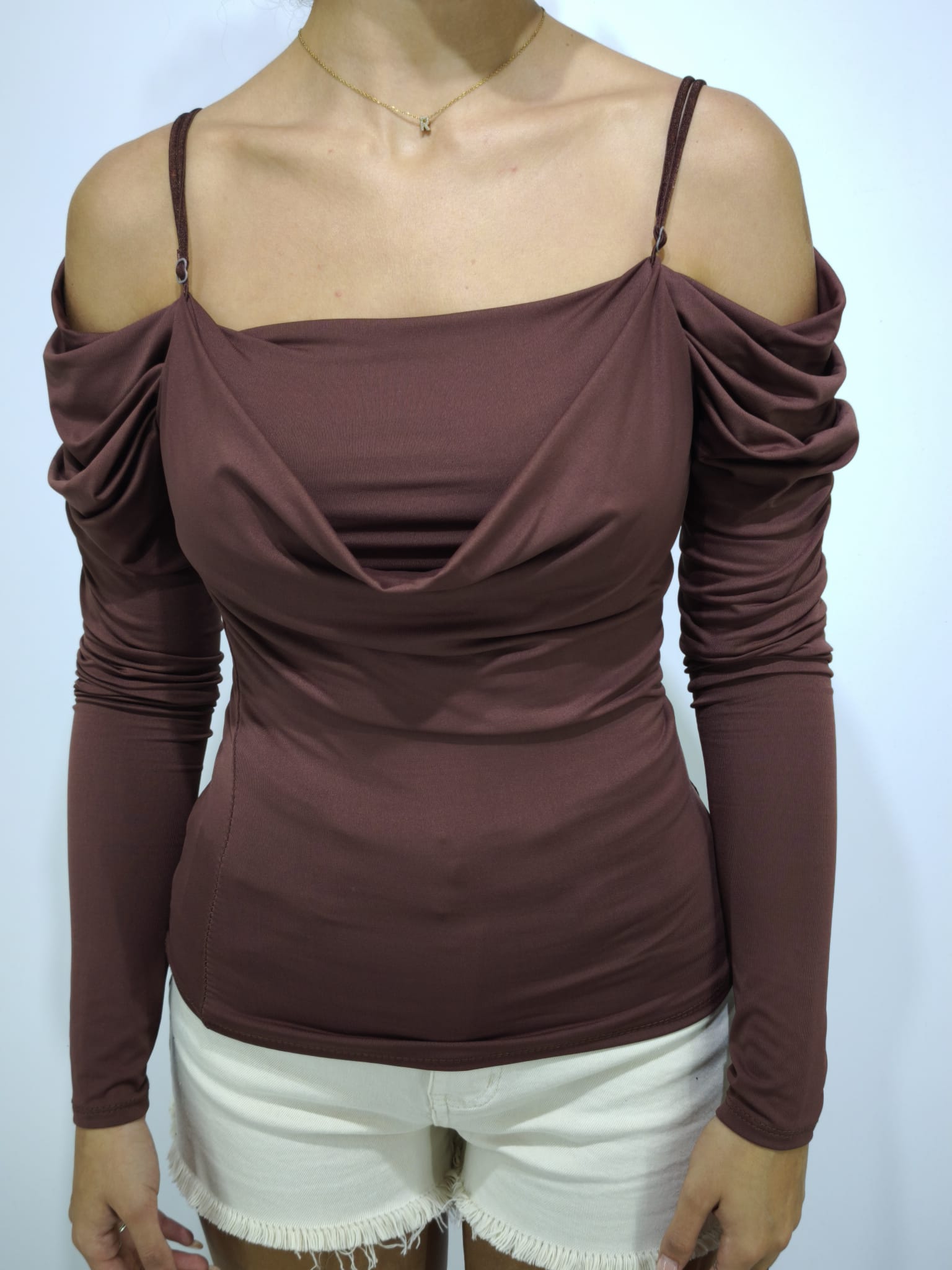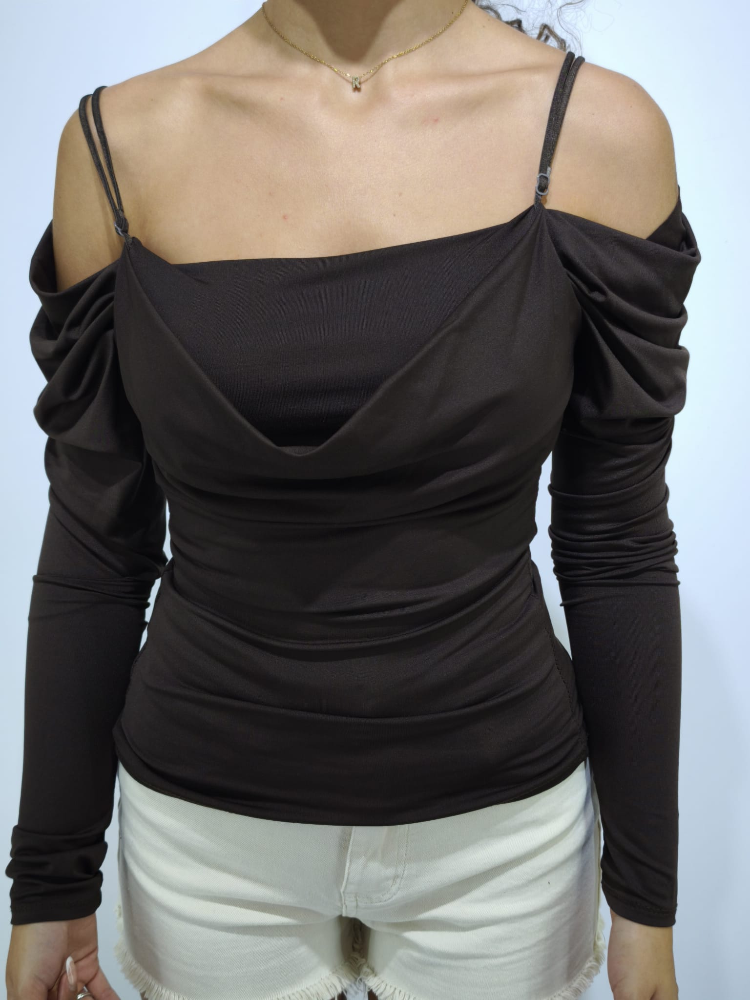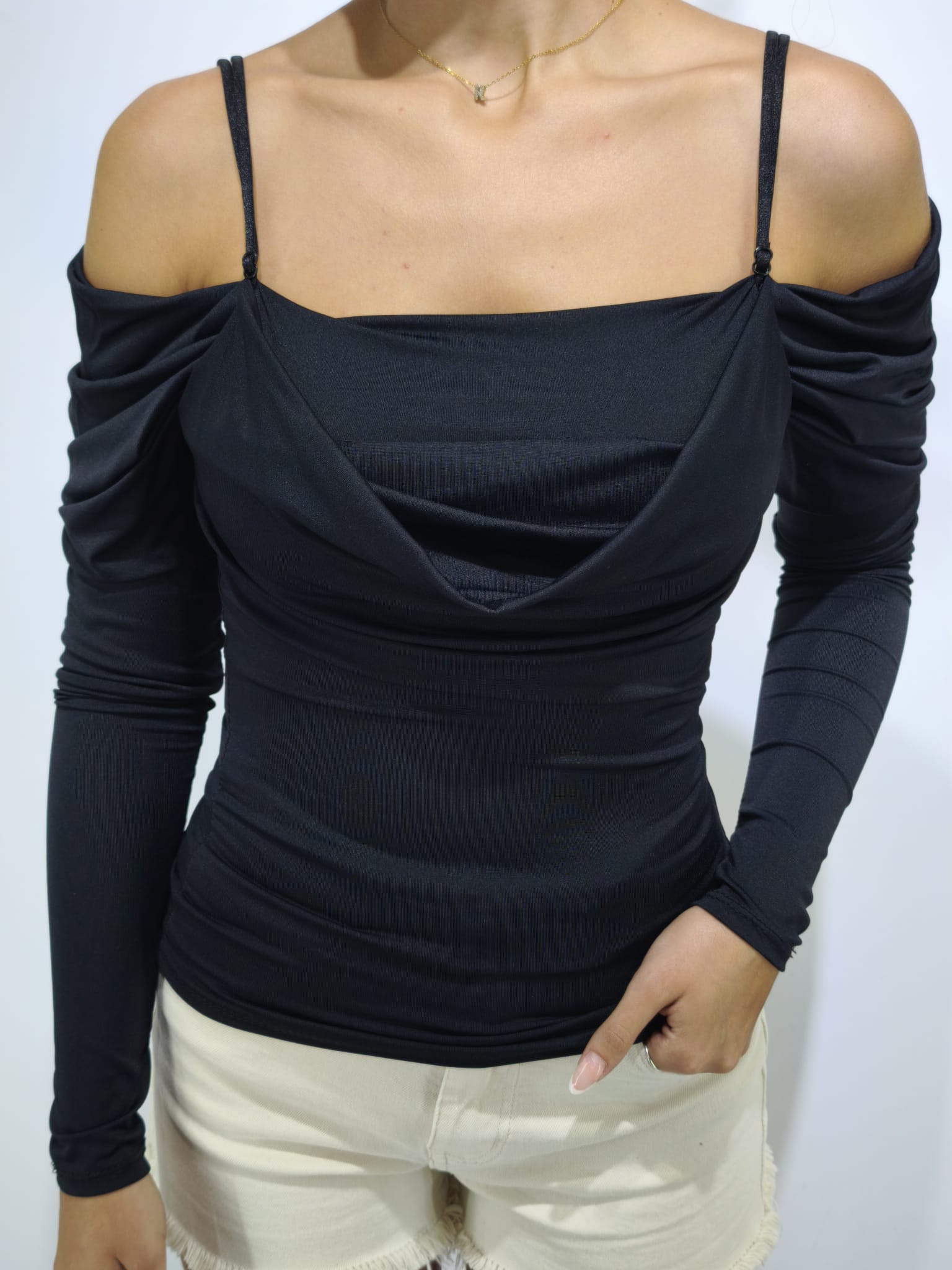 Maglia in lycra, scollo barca, manica lunga con bretelle regolabili.