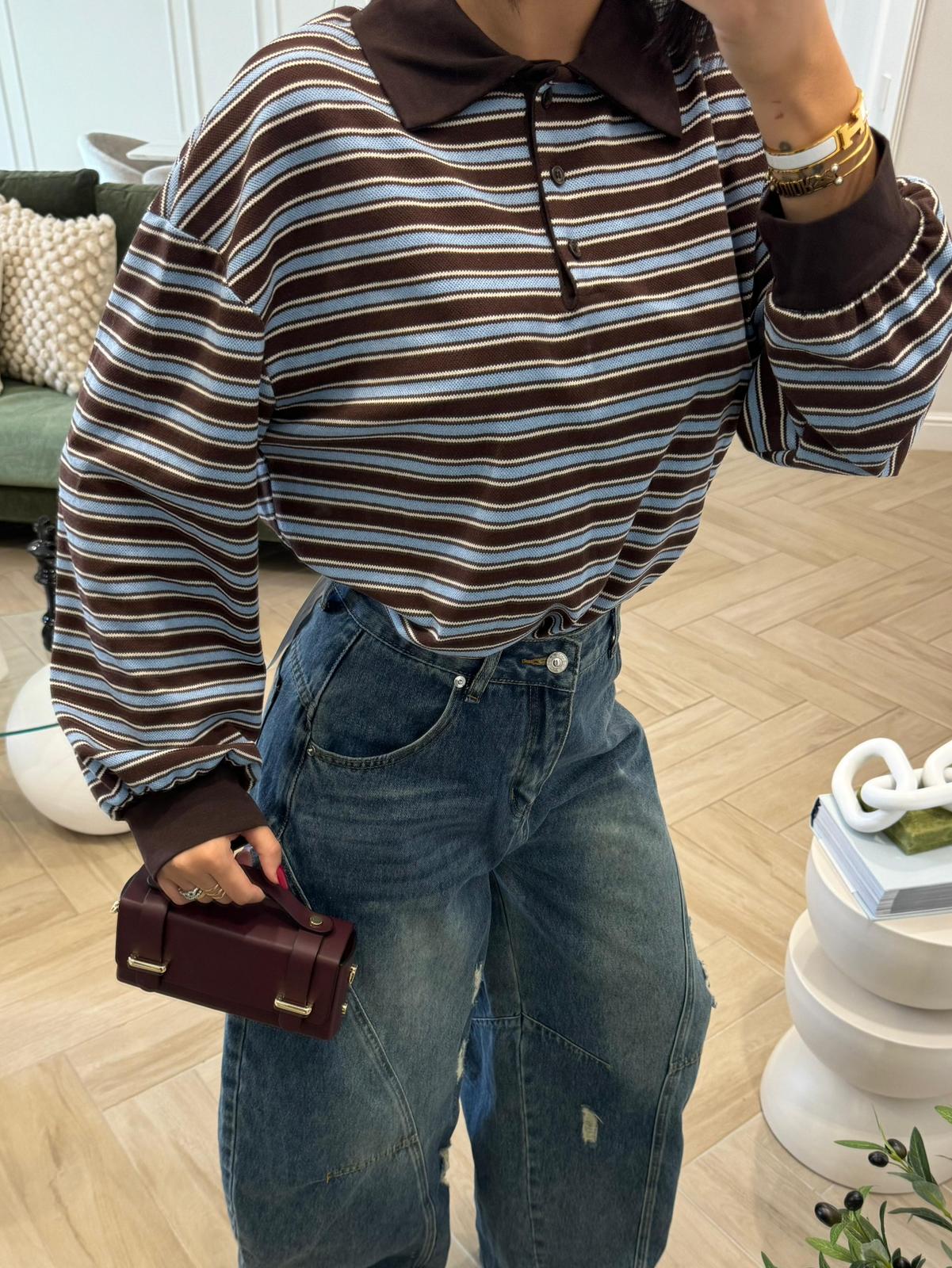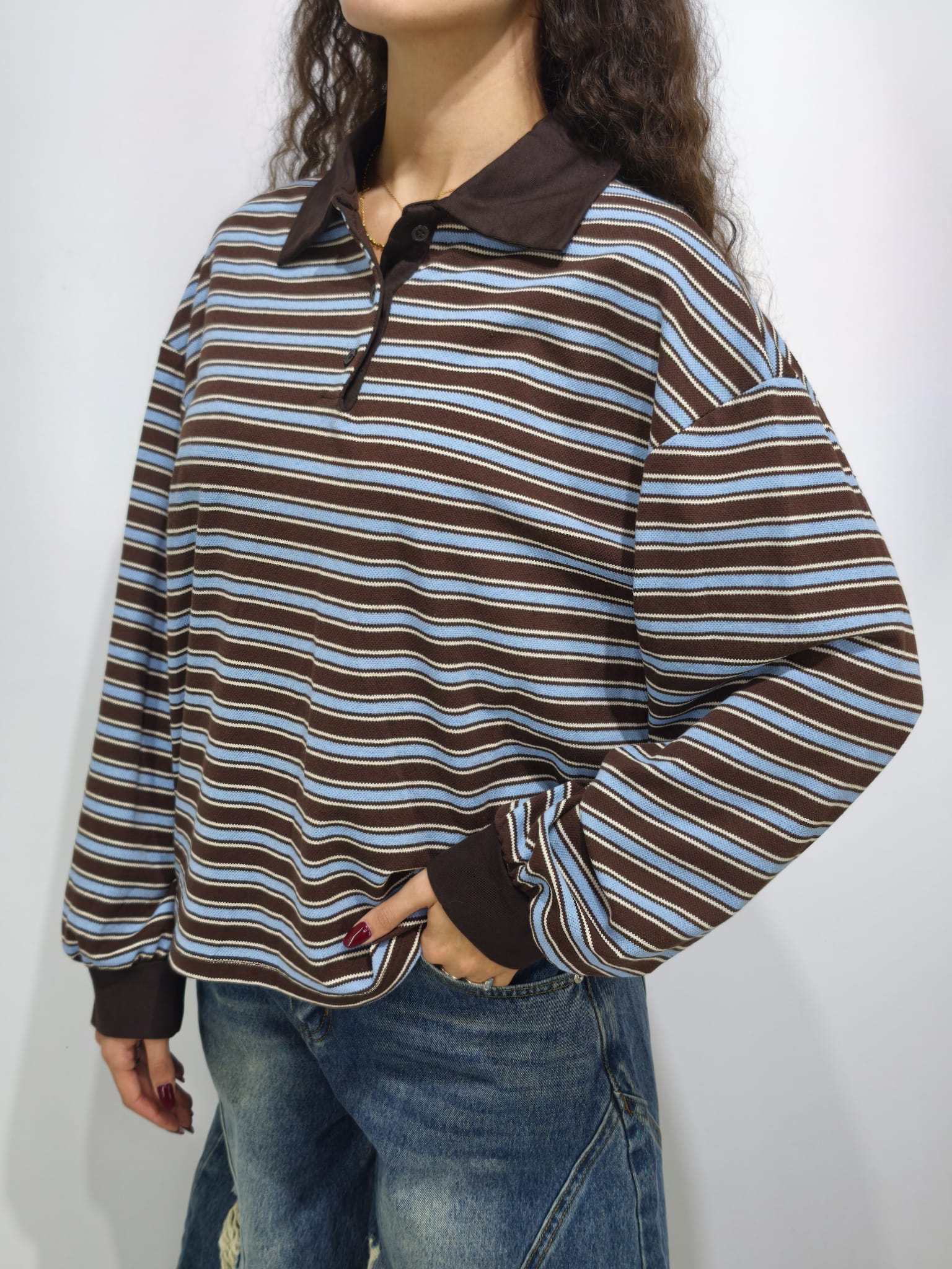 Polo fantasia righe, con bottoni frontali, e polsini.