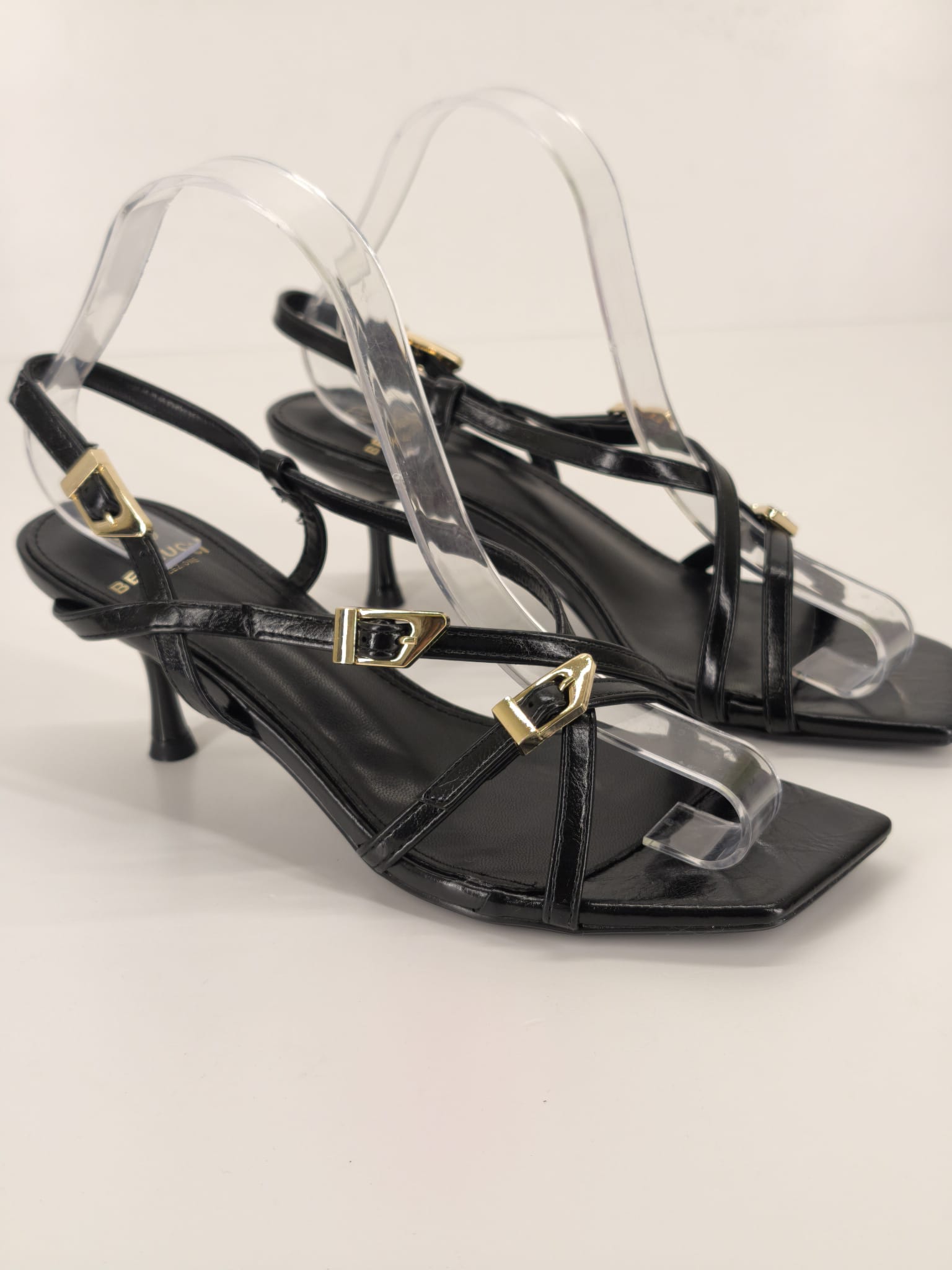 Sandalo basso con tacco a campana alto circa 5 cm.