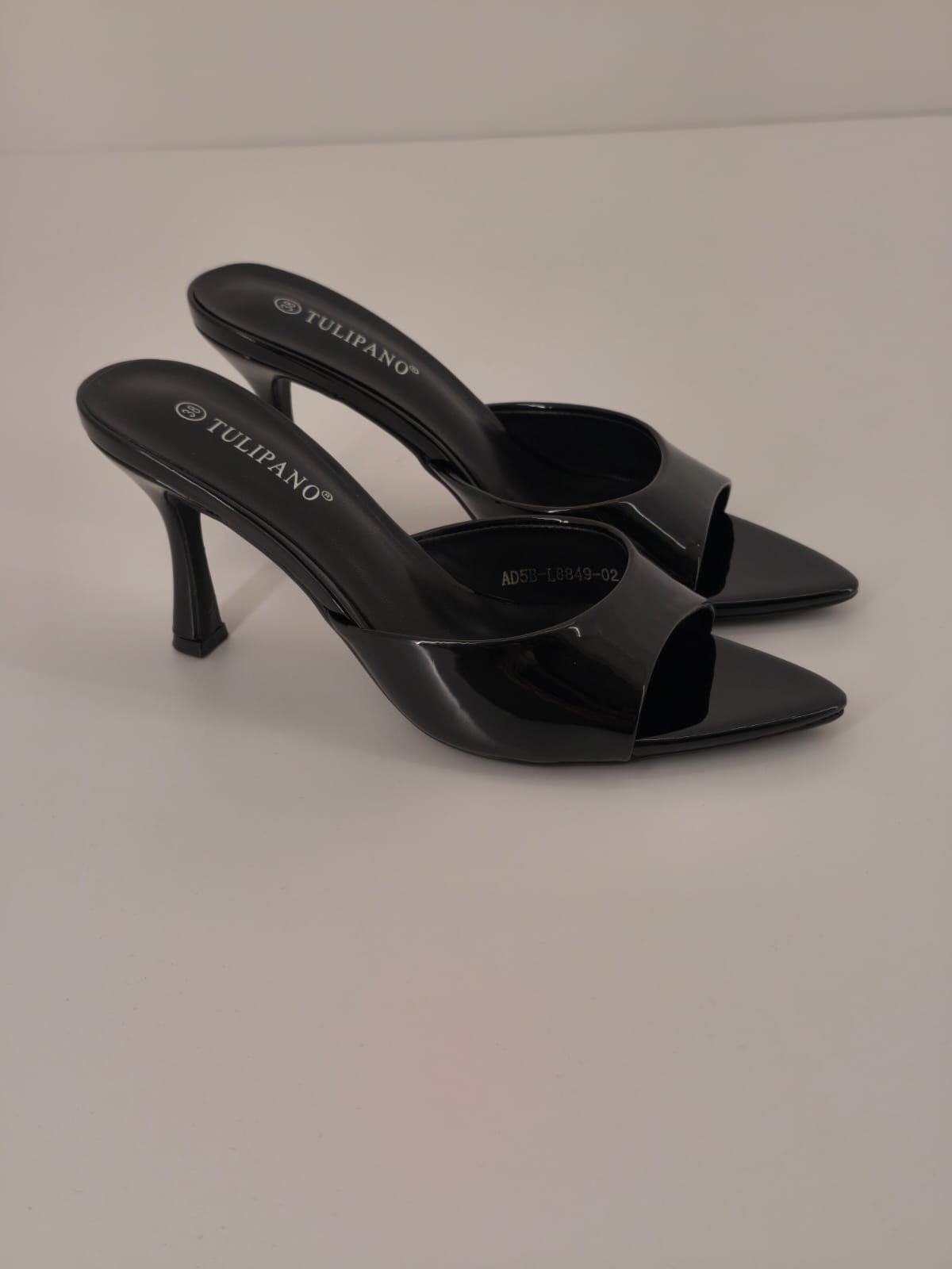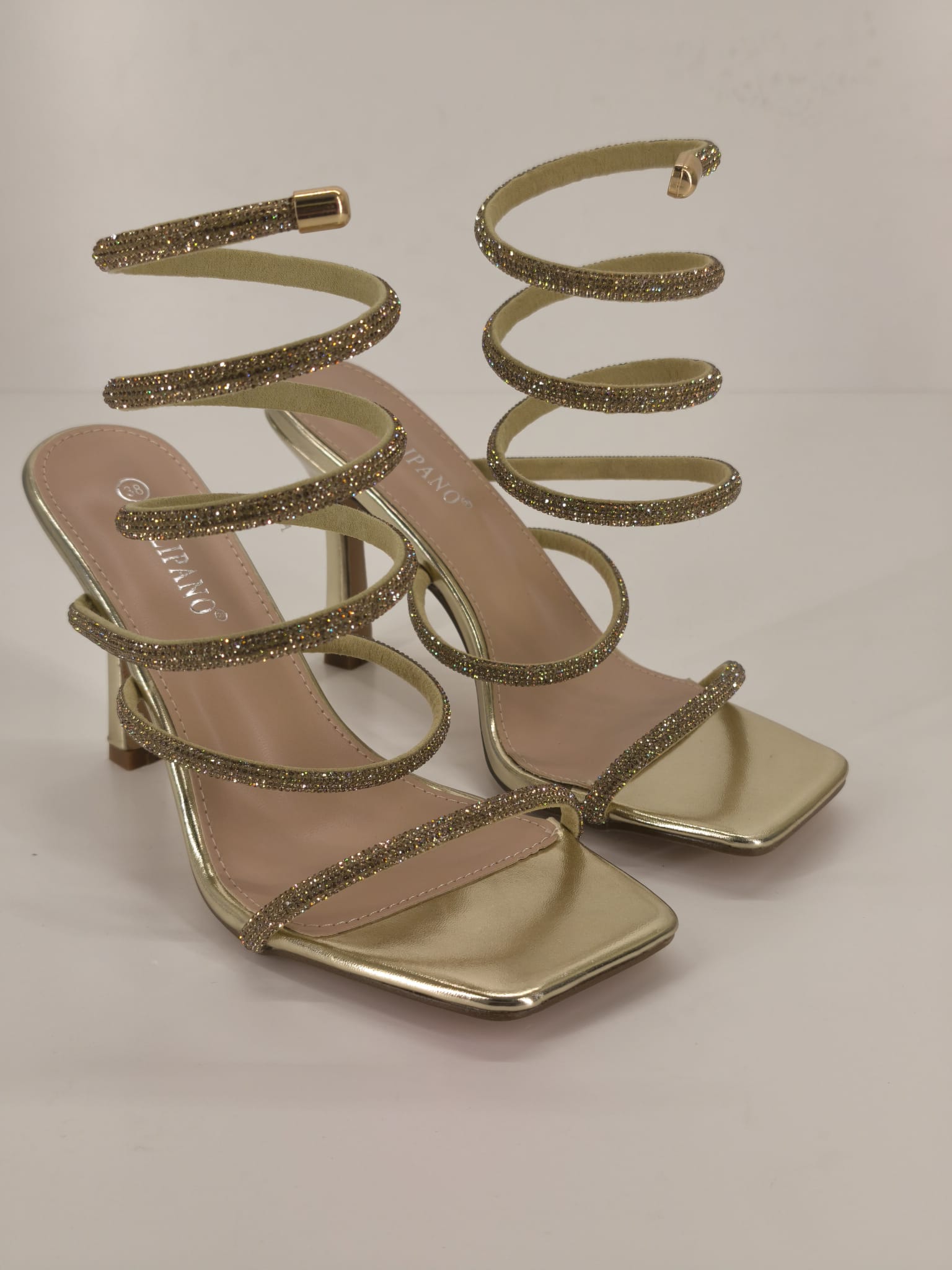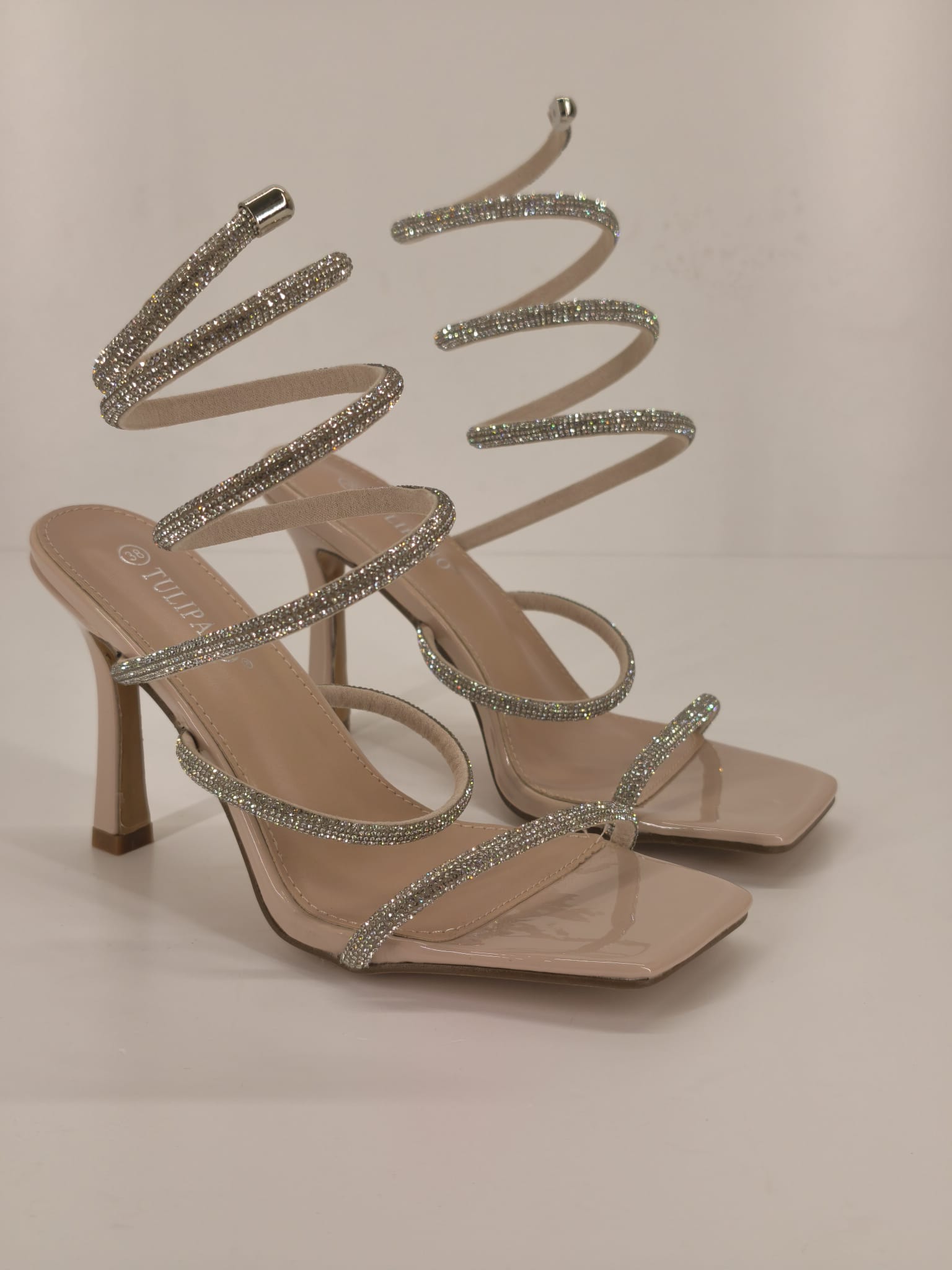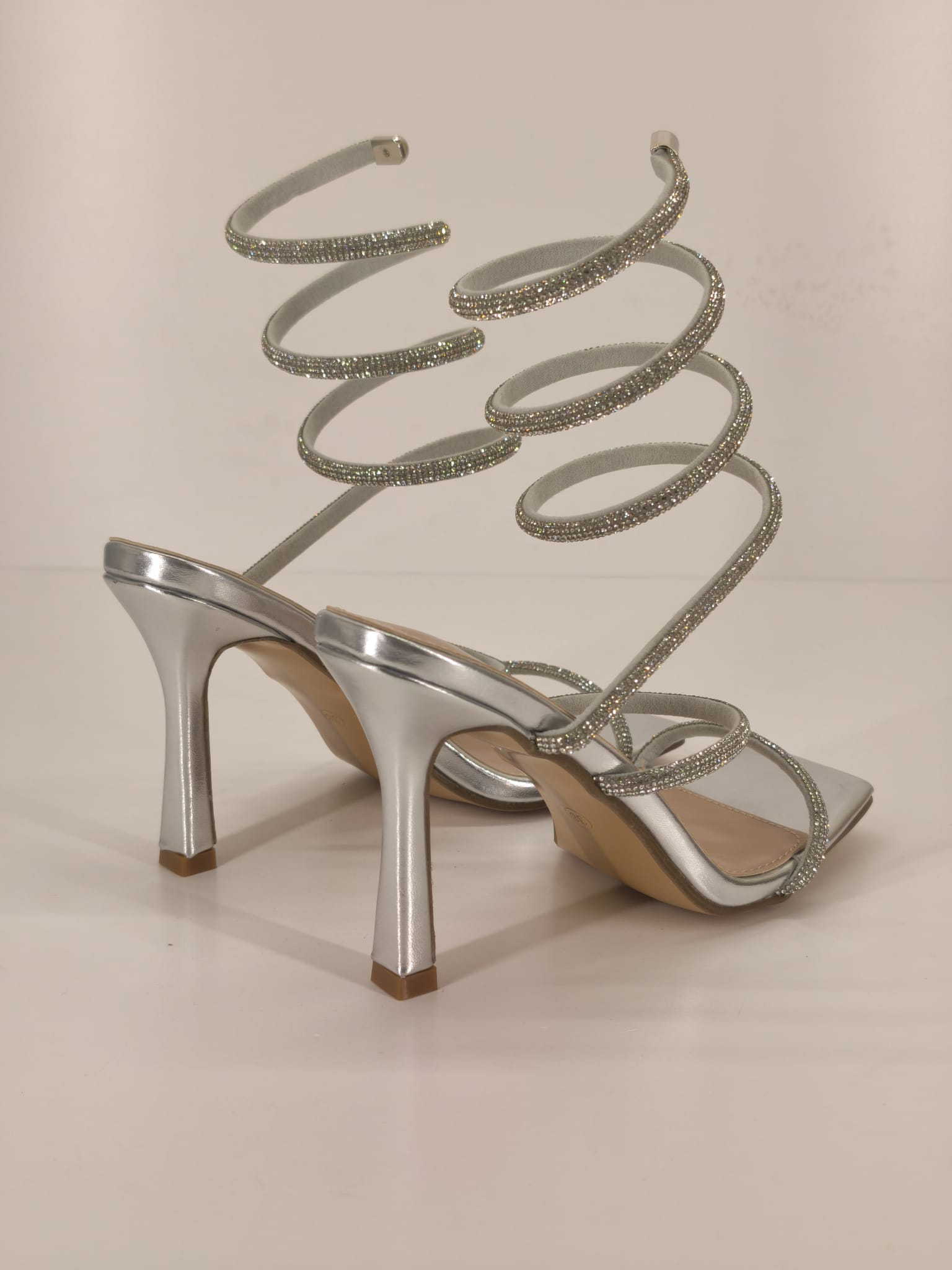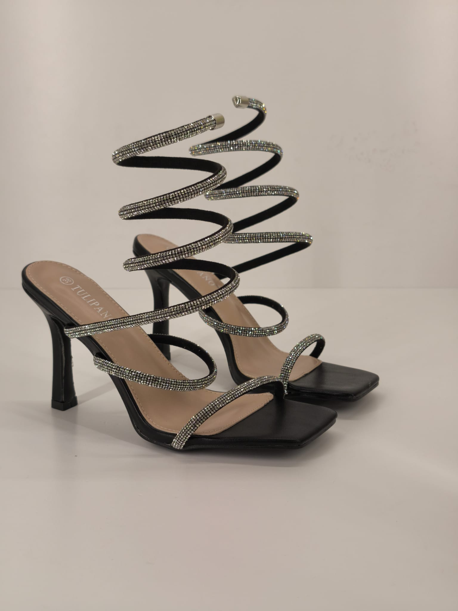 Sandalo serpente ricoperto di strass. tacco a campana alto circa 10 cm.