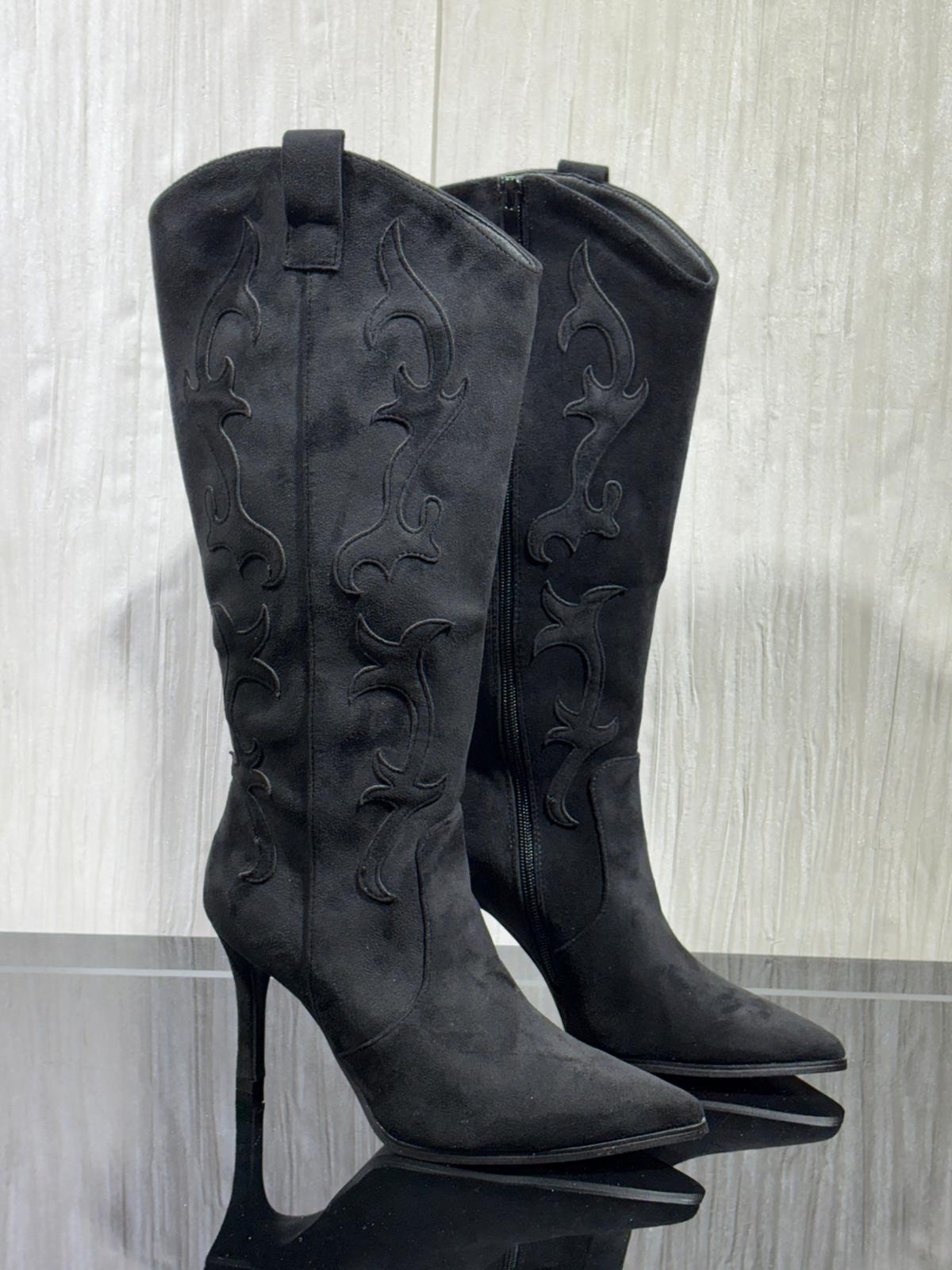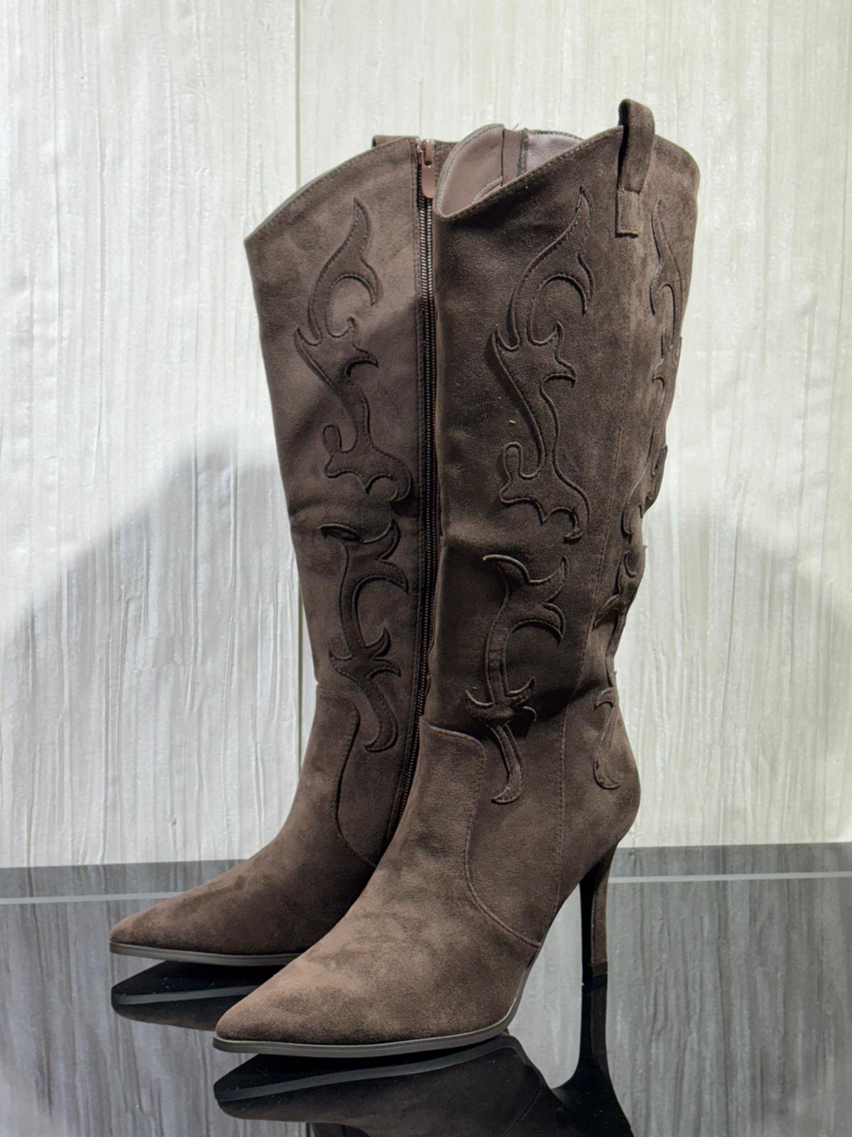Stivale in camoscio e con ricami con zip interna. Tacco a spillo alto circa 8 cm.