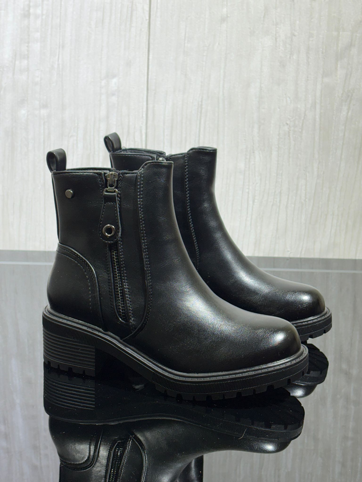 Stivaletto in ecopelle con fondo track. Zip interno caviglia.