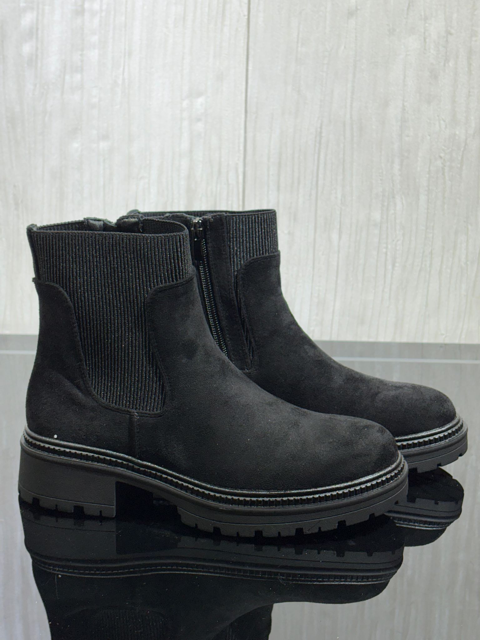 Stivaletto in camoscio con fondo track e con molla sopra caviglia.