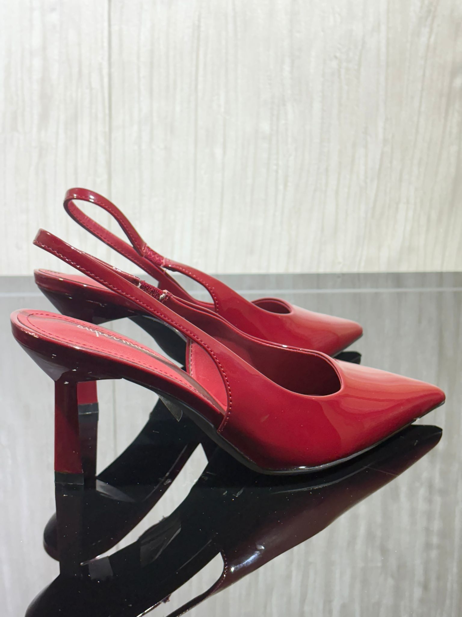 Tronchetto lucido, con tacco a campana con fibbie laterali. Zip interna.