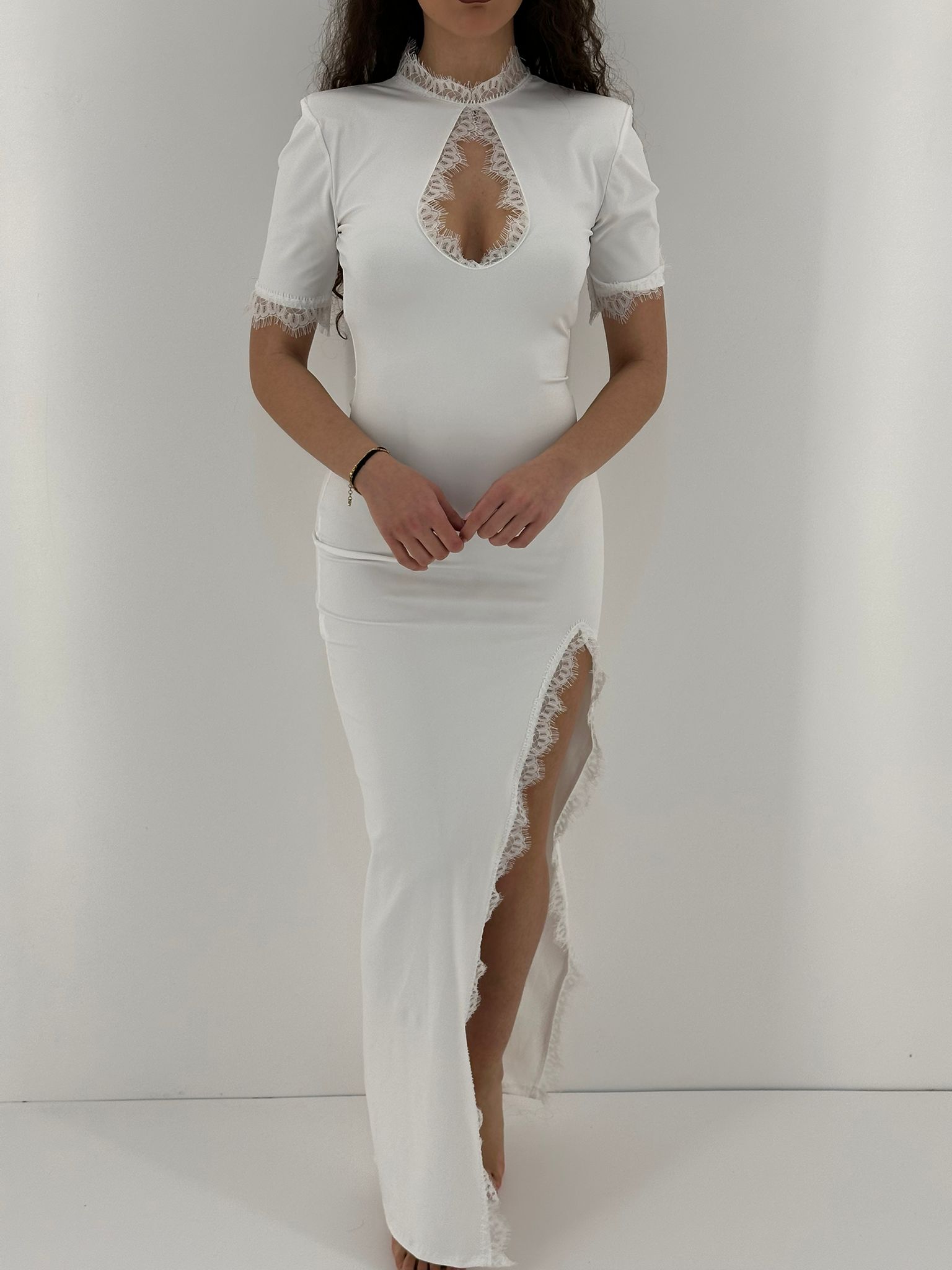 Vestito lungo, in pizzo in lycra, con spacco laterale.